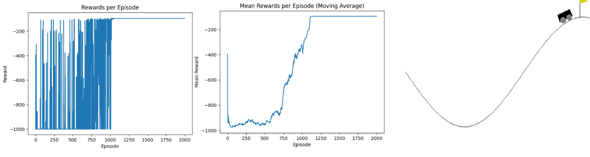 Tabular Q-learning agent solving the classic MountainCar-v0 control problem. The car learns to build momentum by rocking back and forth to reach the goal — a counter-intuitive strategy discovered autonomously through the Bellman equation and epsilon-greedy exploration.